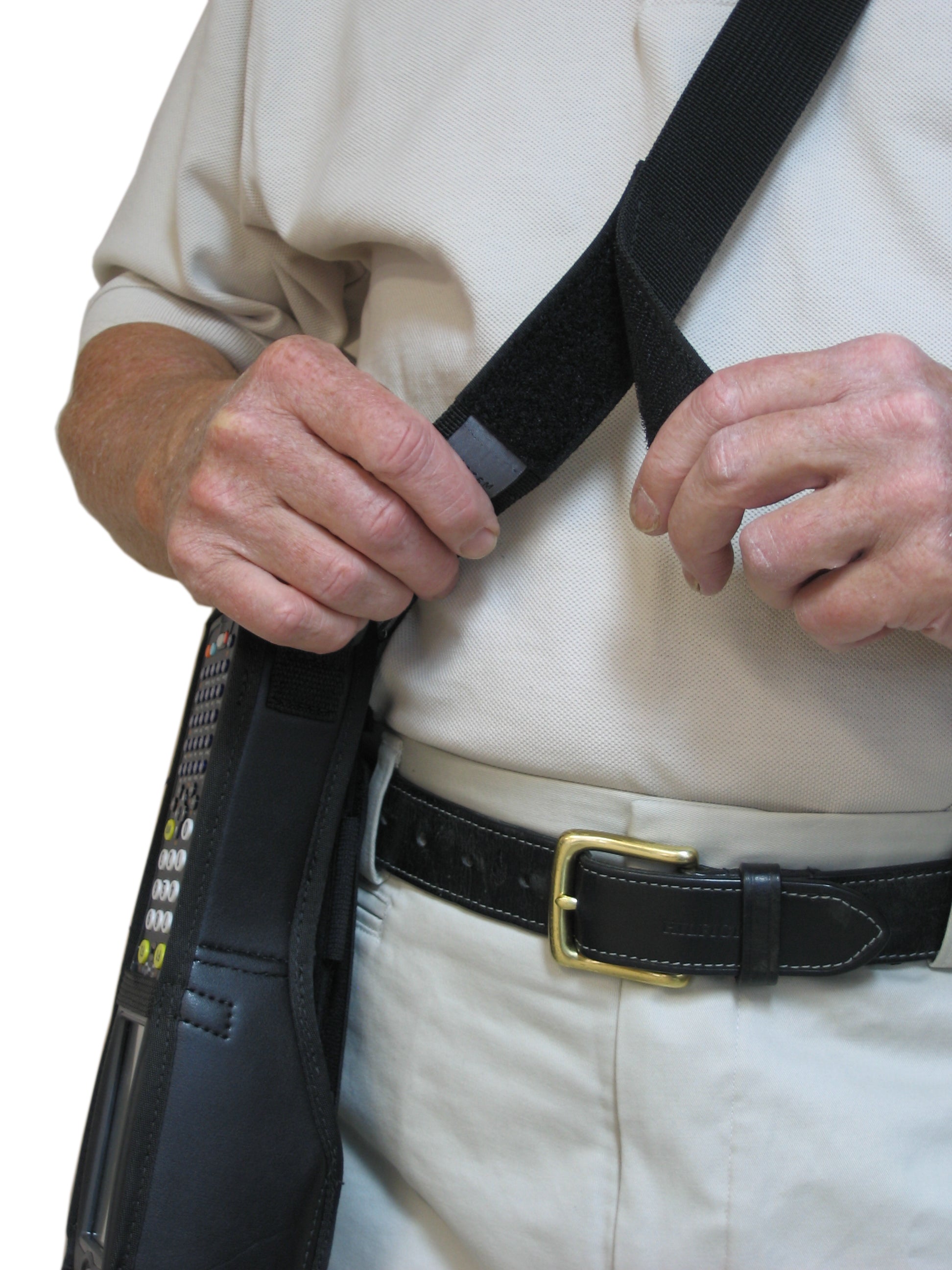 This option is similar to a regular shoulder strap but with the added tear away safety feature. Worn over the shoulder and across the body—ideal if user is not wearing a belt or does not want anything around the waist.